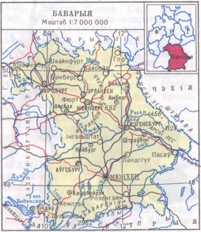 зямля (адм. адзінка) на Пд ФРГ. Пл. 70,6 тыс. км². 11,9 млн. чал.(1994). Адм. ц.г. Мюнхен; найбуйнейшыя гарады: Нюрнберг, Аўгсбург, Рэгенсбург, Вюрцбург, Пасаў. Амаль уся тэр. Баварыі размяшчаецца на Баварскім пласкагор’і і Франконскім Альбе. На У невысокія горы Чэшскага і Баварскага Лесу, Шумавы; на Пд адгор’і Цірольскіх Альпаў (г. Цугшпітцэ, 2963 м). Больш за 30% тэрыторыі пад лесам. Густая сетка рэк (Дунай з прытокамі, Майн), на Пд шмат азёраў.