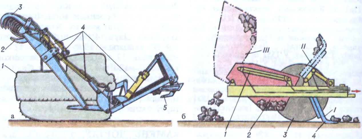 (Каменяўборачныя машыны: а — навясная з пярэднім сківічным захопам (1 — трактар, 2 — зубы, 3 — верхнія захопы, 4 — гідрацыліндры, 5 — заднія зубы); 6 — прычапная (1 — гідрасістэма павароту бункера, 2, 3 — хадавыя колы, 4 — грэбень; I — збіранне камянёў, II — пагрузка іх у бункер, III — выгрузка).