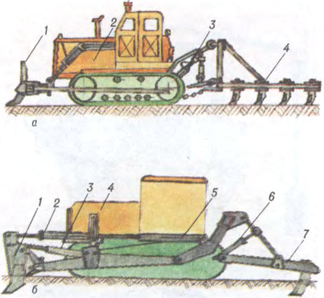 Карчавальныя машыны: а — карчавальны агрэгат (1 — карчавальнік, 2 — трактар, 3 — гідрацыліндр кіравання карчавальнай бараной 4); б — карчавальнік-збіральнік (1 — карчавальнае прыстасаванне з клыкамі; 2, 3, 5, 6 — гідрацыліндры; 4 — трактар; 7 — механізм падрэзкі каранёў).