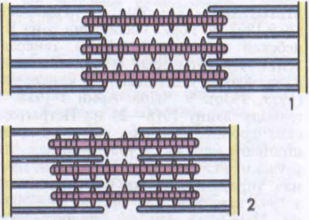 Да арт.Мышачнае скарачэнне: саркамер расслабленага (1) і скарочанага (2) мышачнага валакна.