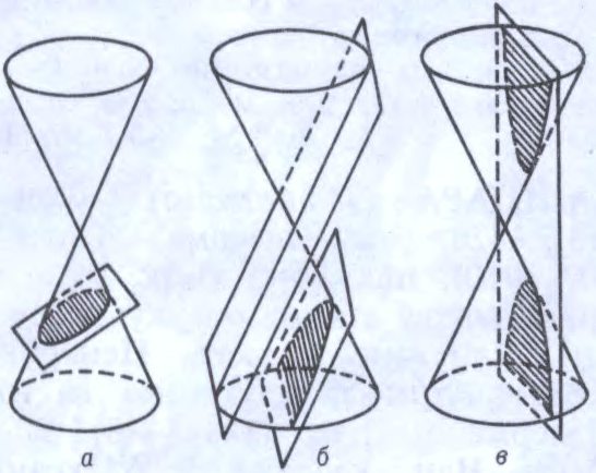 Да арт.Канічныя сячэнні: а — эліпс; б — парабала; в — гіпербала.