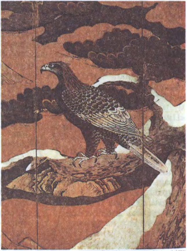 Да арт.Кано. Кано Эйтоку. Арол на хвоі. Дэталь размалёўкі шырмы. Канец 16 ст.