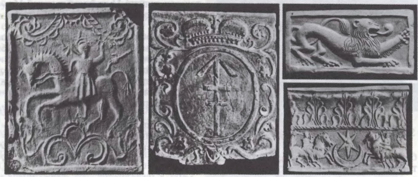 Да арт.Заслаўская кафля. Кафлі: злева — з выявай конніка, 17 ст.; з выявай герба Сапегаў, 2-я пал. 17 ст.; справа — вуглавая, канец 16 ст.; карнізная, канец 16 ст.