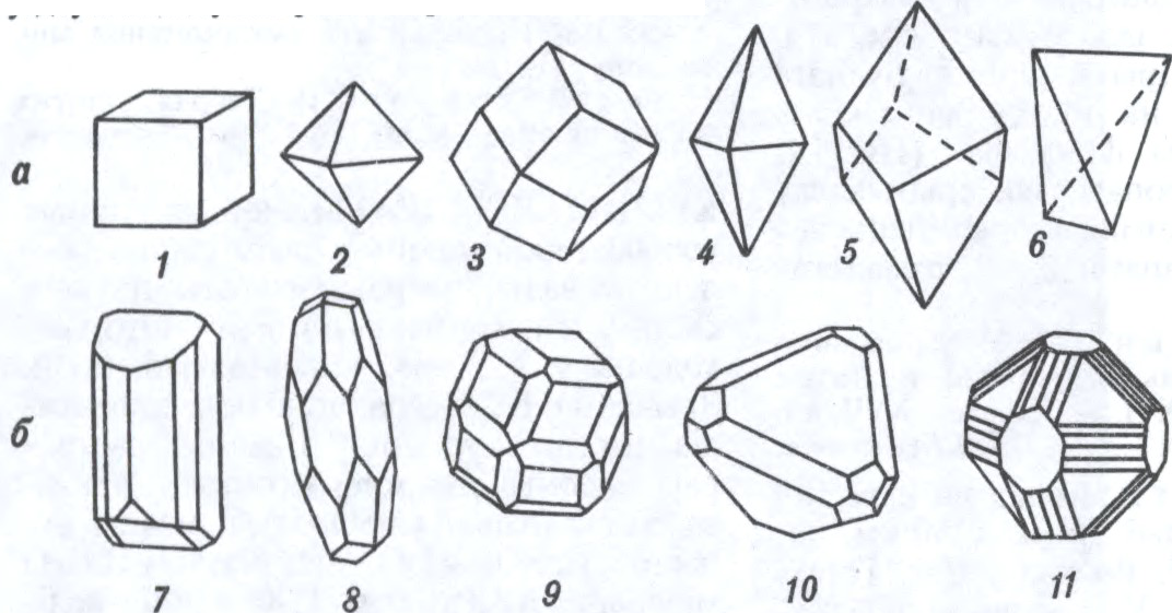 Крышталі: а — простыя формы (1 — куб, 2 — актаэдр, 3 — ромбададэкаэдр, 4 — тэтраганальная дыпіраміда, 5 — трыганальны трапецоэдр, 6 — рамбічны тэтраэдр); б — камбінацыі простых форм (7 — пінакоіды і рамбічныя прызмы, 8 — гексаганальная прызма, рамбоэдр, дытрыганальны скаленоэдр, 9 — ромбададэкаэдр, тэтрагонтрыактаэдр, 10 — куб, тэатраэдр, ромбададэкаэдр, 11 — куб, актаэдр, трыгонтрыактаэдры).