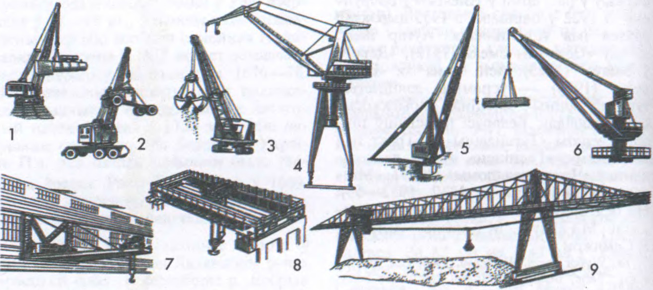Асн. часткі П.к.: нясучыя канструкцыі (маставая ці кансольная ферма, вежа, мачта, страла, партал), гал. грузапад’ёмны механізм (лябёдка, тэльфер), сілавая ўстаноўка (электрычны рухавік, дызель і інш.), механізмы перамяшчэння крана, павароту, грузазахопныя прыстасаванні і інш. Паваротныя П.к. бываюць: чыгуначныя, веласіпедныя (з рэйкамі на розных узроўнях), пнеўмаколавыя, аўтакраны, гусенічныя, насценныя і дахавыя. Непаваротныя: маставыя з катучай маставой фермай, што перамяшчаецца па рэйках (у т.л. кран-бэлькі), перагрузачныя (маставыя перагружальнікі, казловыя і кабельныя краны), насценна-кансольныя. Ёсць таксама паваротныя і непаваротныя плывучыя краны, высокія мачтавыя і вежавыя краны, спец. металургічныя і інш. У цяжкадаступных месцах выкарыстоўваюць верталёты-краны. Грузападымальнасць П.к. да 2,5 тыс. т. Простыя драўляныя П к выкарыстоўваліся да канца 18 ст., суцэльнаметалічныя з’явіліся ў 1820-х г., з мех. прыводам — у 1830-х г.Паравы П.к. створаны ў 1830, гідраўлічны ў 1847 (Вялікабрытанія), з электрарухавіком у 1880—85, з рухавіком унутр. згарання ў 1895 (ЗША, Германія). У Расіі вытв-сць П.к. пачата ў канцы 19 ст.