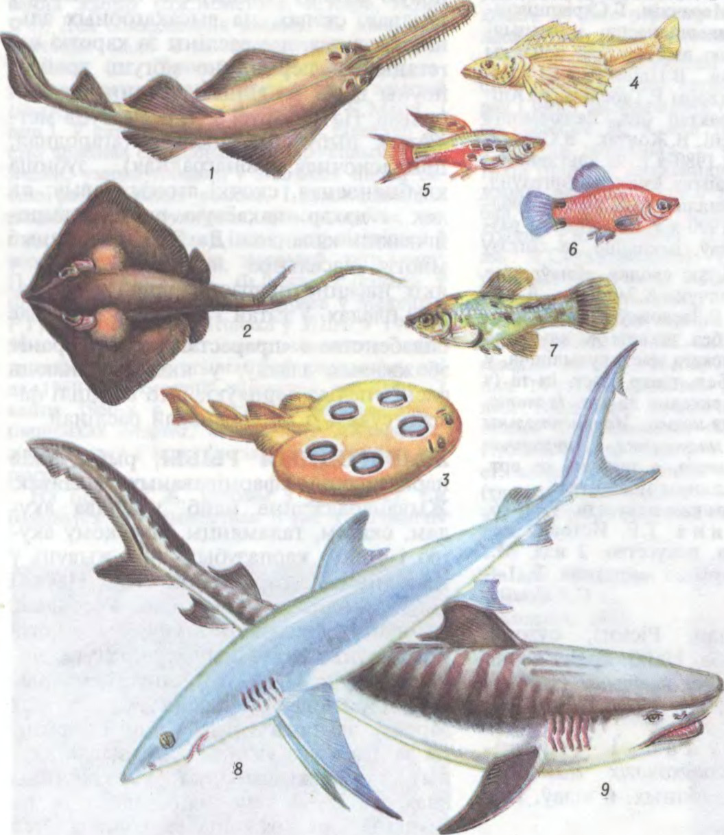 Жывародныя рыбы. Скаты: 1 — піла-рыба; 2 — хвастакол, або марскі кот; 3 — звычайны электрычны; 4 — вялікая галамянка. Акварыумныя рыбы 5 — гупі; 6 — пецылія; 7 — малінезія (самка). Акулы: 8 — сіняя; 9 — тыгровая.