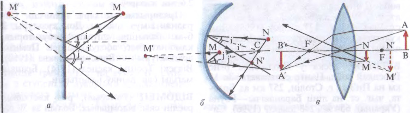 Утварэнне відарысаў аптычных: а — уяўнага відарыса M′ пункта M у плоскім люстэрку; б уяўнага відарыса M′ пункта M і сапраўднага відарыса N′ пункта N ва ўвагнутым сферычным люстэрку; в — сапраўднага A′B′ і ўяўнага M′N′ відарысаў аб’ектаў AB і MN у збіральнай лінзе; i, j — вуглы падзення, а i′, j′ — вуглы адбіцця прамянёў святла; C — цэнтр сферы; F, F′ — фокусы лінзы.