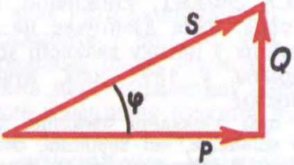 Магутнасць электрычная пераменнага току: P — актыўная; Q — рэактыўная; S — поўная; φ — вугал зруху фаз паміж напружаннем і токам.