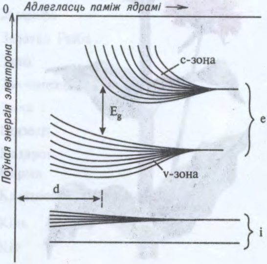 Аснова З.т. — аднаэлектроннае прыбліжэнне: скорасць руху атамных ядраў каля становішчаў раўнавагі многа меншая за скорасць электронаў; кожны электрон рухаецца ў трохмерна-перыядычным полі, якое ствараецца ядрамі і астатнімі электронамі. Зона праводнасці (с) і валентная зона (v) утвораны сукупнасцю атамных энергет. узроўняў, «расшчэпленых» у выніку аб’яднання свабодных атамаў у крышт. рашотку. Узроўні энергіі валентных электронаў (е) атама расшчапляюцца і зрушваюцца значна больш, чым узроўні ўнутраных электронаў (і). Шырыня забароненай зоны Eg (энергет. шчыліна паміж v- і с-зонамі) вызначаецца раўнаважнай адлегласцю паміж ядрамі (пастаяннай крышт. рашоткі d) У крышталі з N ідэнтычных атамаў кожны атамны ўзровень расшчапляецца на N узроўняў, якія ўтвараюць квазінеперарыўную дазволеную зону або яе частку. Электроны запаўняюць дазволеныя зоны энергій у адпаведнасці з Паўлі прынцыпам: на N узроўнях зоны можа знаходзіцца не больш за 2N электронаў. Уласцівасці крышталя залежаць ад колькасці электронаў у зоне праводнасці і/ці ад колькасці незапоўненых узроўняў (вакансій для электронаў) у валентнай зоне. Калі энергет. зона запоўнена электронамі часткова, то пад уздзеяннем знешняга эл. поля яны пераразмяркоўваюцца па ўзроўнях у зоне. Пры гэтым парушаецца сіметрыя размеркавання электронаў па скорасцях — узнікае эл. ток. Таму крышталь з часткова запоўненай c-зонай з’яўляецца правадніком электрычнасці — металам. Электроны ў поўнасцю запоўненай v-зоне з-за прынцыпу Паўлі не могуць пераразмяркоўвацца па ўзроўнях энергіі; крышталь з пустой с-зонай і поўнасцю запоўненай электронамі v-зонай — дыэлектрык. Калі цеплавая энергія дастатковая для пераводу часткі электронаў з v-зоны ў c-зону, то электраправоднасць крышталя расце пры награванні; такі крышталь — паўправаднік. Пры слаба перакрытых с- і v-зонах крышталь з’яўляецца паўметалам (напр., вісмут), а пры змыканні гэтых зон (Eg=0) — бясшчылінным паўправадніком (напр., шэрае волава). З.т. — набліжэнне да рашэння фундаментальнай задачы: вывесці ўласцівасці крышталя з уласцівасцей атамаў, з якіх ён складаецца.