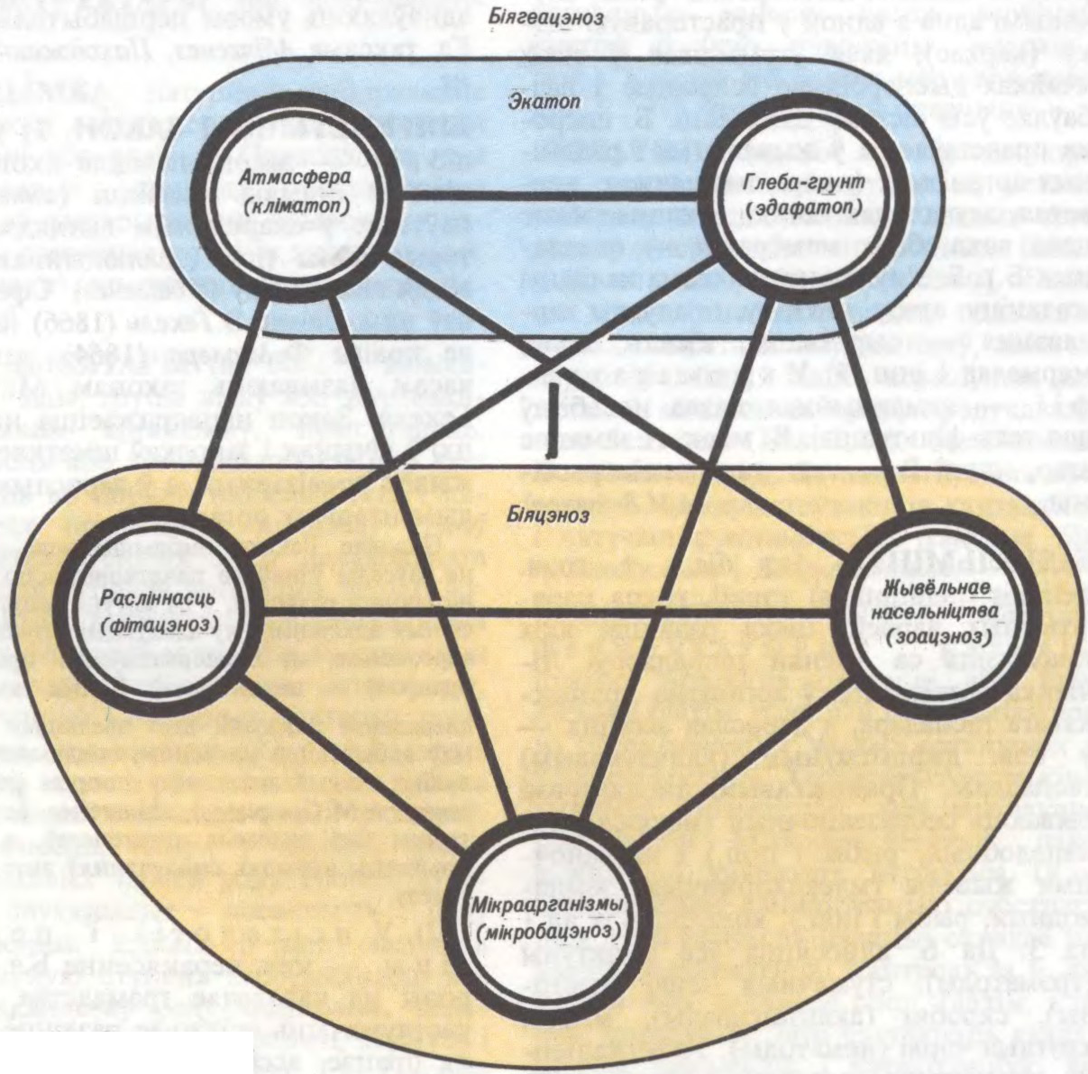 узаемаабумоўлены комплекс жывых і нежывых кампанентаў, звязаных паміж сабой абменам рэчываў і абменам энергіі; адна з найб. складаных прыродных сістэм. Паняцце біягеацэнозу прапанаваў сав. вучоны У.М.Сукачоў (1940). Жывыя кампаненты біягеацэнозу — аўтатрофы (фотасінтэзавальныя зялёныя расліны, хемасінтэзавальныя мікраарганізмы) і гетэратрофы (жывёлы, грыбы, многія бактэрыі, вірусы), нежывыя — прыземны слой атмасферы з газавымі і цеплавымі рэсурсамі, сонечная энергія, глеба з водамінер. рэсурсамі і часткова кара выветрывання (у водным біягеацэнозе — вада). Сукупнасць усіх жывых арганізмаў біягеацэнозу (біяцэноз) уключае прадуцэнтаў (пераважна зялёныя расліны), што ўтвараюць арган. рэчывы, кансументаў (жывёлы) і рэдуцэнтаў (мікраарганізмы), якія жывуць за кошт гатовых арган. рэчываў і ажыццяўляюць іх раскладанне да простых мінер. кампанентаў, зноў спажываных раслінамі. Біягеацэноз — элементарная адзінка біясферы зямнога шара. Межы біягеацэнозу — канкрэтныя раслінныя згуртаванні. Блізкі да біягеацэнозу тэрмін фацыя.
