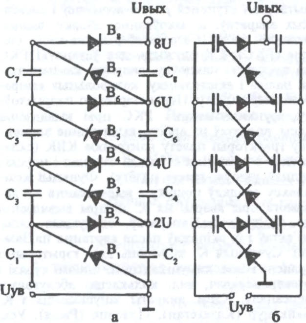 Схемы каскадных генератараў на ёмістасцях: а — з паслядоўным сілкаваннем (C — ёмістасці; B — электрычныя вентылі); б — з паралельным сілкаваннем.