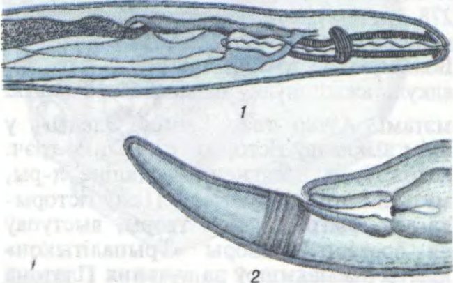 Дыктыякаўла жывародная: 1 — галаўны, 2 — хваставы канцы цела самкі.