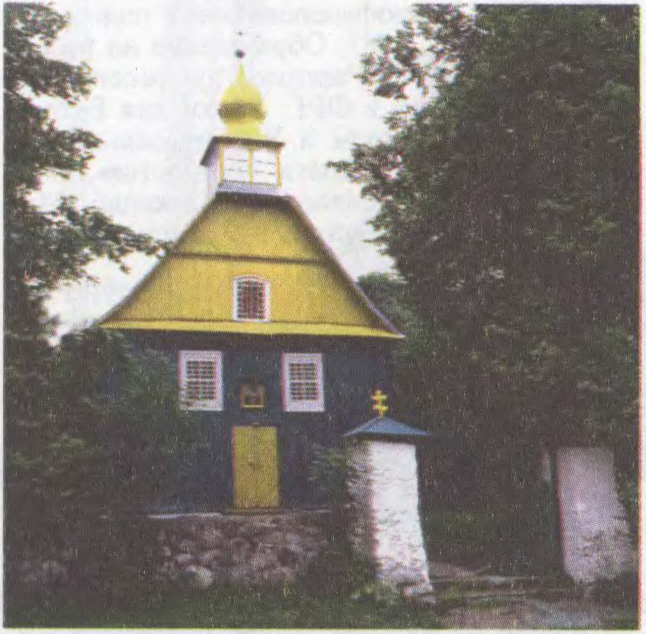 трохвугольныя навісі ў месцы прымыкання зрубаў. Гал.фасад завершаны трапецападобным франтонам з дэкар. шалёўкай і вял. лучковым аконным праёмам у цэнтры. Франтон увянчаны чацверыковай вежачкай з галоўкай. Такая ж галоўка над алтаром. Па баках алтарнага зруба невысокія квадратныя сакрысціі. У архітэктуры спалучаюцца рысы традыц.нар. дойлідства і стылю барока.