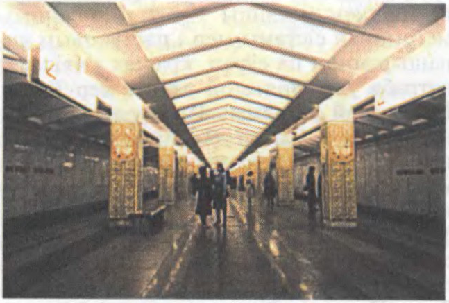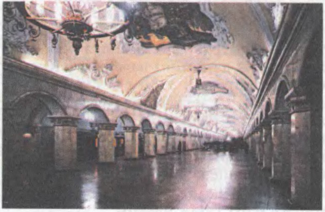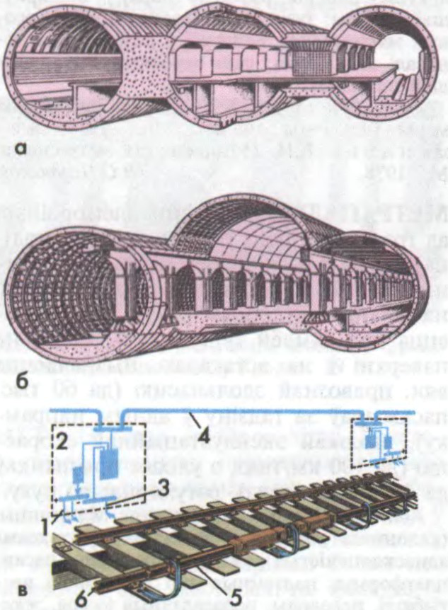 Метрапалітэн: а — станцыя пілоннага тыпу з абліцоўкай жалезабетоннымі цюбінгамі; б — станцыя калоннага тыпу з павялічаным пралётам сярэдняй залы; в — схема электрасілкавання кантактавай рэйкі (1 — кабелі сілкавання трэцяй рэйкі, 2 — цягавая падстанцыя, 3 — зваротны кабель ад хадавых рэек, 4 — сілавыя кабелі, 5 — трэцяя рэйка, 6 — хадавая рэйка).Да арт.Метрапалітэн. Станцыя «Камсамольская-кальцавая» ў Маскве. 1952. Арх. А.Шчусеў і інш.Да арт.Метрапалітэн. Станцыя «Плошча Якуба Коласа» ў Мінску. 1984. Арх. М.Пірагоў, А.Зензін, маст. В.Чурыла, С.Сакалоў.