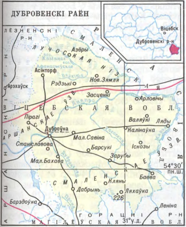 на ПдУ Віцебскай вобл. Утвораны 17.7.1924. Пл. 1,3 тыс.км². Нас. 24 тыс.чал. (1997), гарадскога 38%. Сярэдняя шчыльн. 20 чал. на 1 км². Цэнтр раёна — г.Дуброўна, р.п.Асінторф, 149 сельскіх населеных пунктаў. Падзяляецца на 10 сельсаветаў: Баеўскі, Валяўкоўскі, Дабрынскі, Зарубскі, Засценкаўскі, Кляноўскі, Малабахаўскі, Маласавінскі, Пірагоўскі, Рэдзькаўскі.
