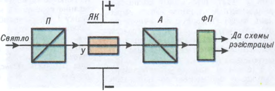Схема назірання электрааптычнага Кера эфекту: П — палярызатар святла; ЯК — ячэйка Кера; А — аналізатар святла; ФП — фотапрыёмнік; У — узор.