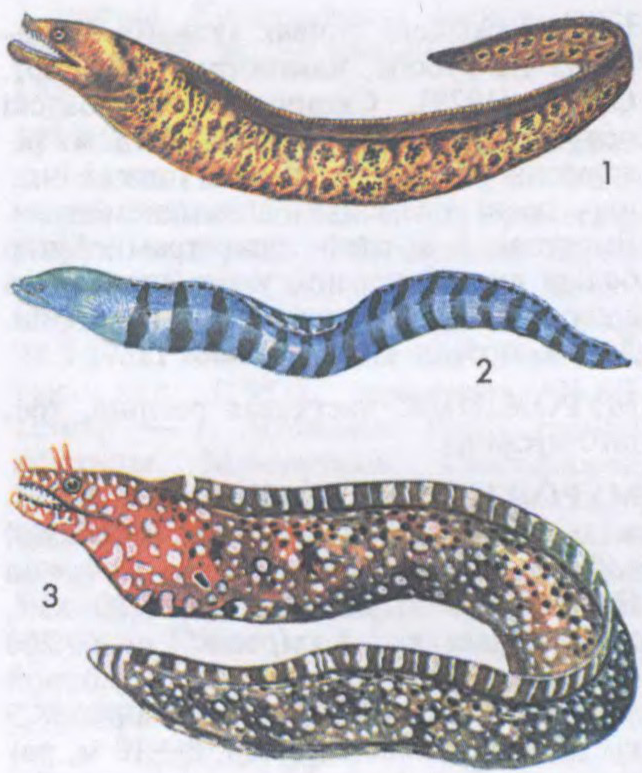 Даўж. ад 10 см да 3 м. Цела змеепадобнае, скура голая. Афарбоўка яркая, разнастайная, з плямамі і палосамі. Грудныя плаўнікі адсутнічаюць. Зубы шматлікія, доўгія, вострыя. Драпежнікі, кормяцца рыбамі, галаваногімі малюскамі, ракападобнымі. У развіцці праходзяць стадыю лептацэфала (кароткае тупое рыла, закруглены хваставы плаўнік, слабая пігментацыя). Аб’ект промыслу. У некаторых відаў М. мяса ядавітае.
