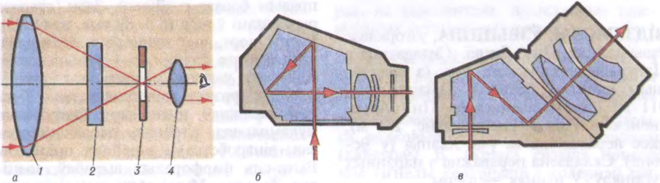 Аптычная схема відашукальніка: а — тыпу трубы Кеплера; б, в — люстраных фотаапаратаў; 1 — аб’ектыў; 2 — абарачальная сістэма; 3 — рамка; 4 — акуляр.