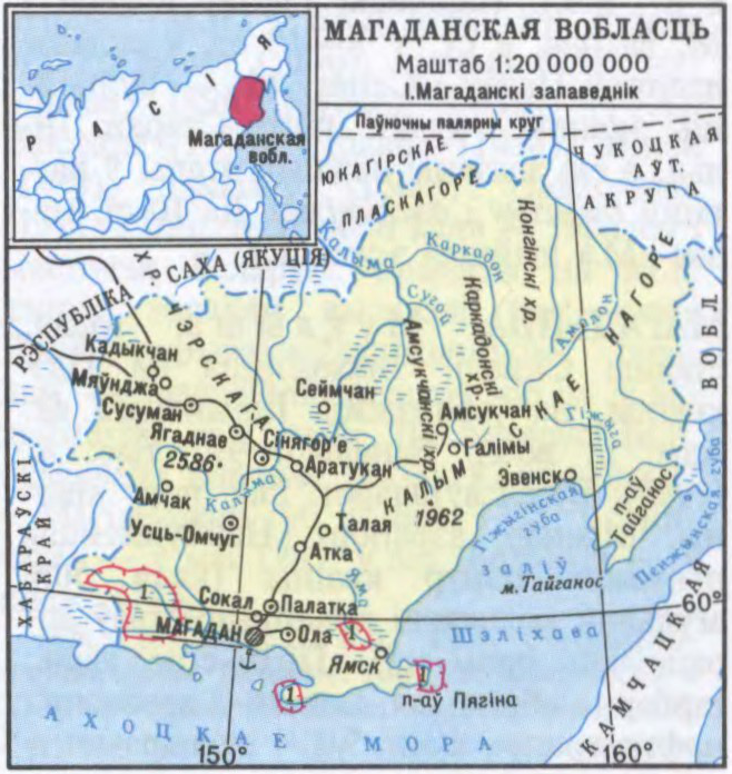 МАГАДА́НСКАЯ ВО́БЛАСЦЬ Размешчана на ПнУРас. Федэрацыі. Абмываецца Ахоцкім м. Утворана 3.12.1953. Пл. 461,4 тыс.км2. Нас. 258 тыс.чал. (1997), гарадскога 90%. Цэнтр — г.Магадан.