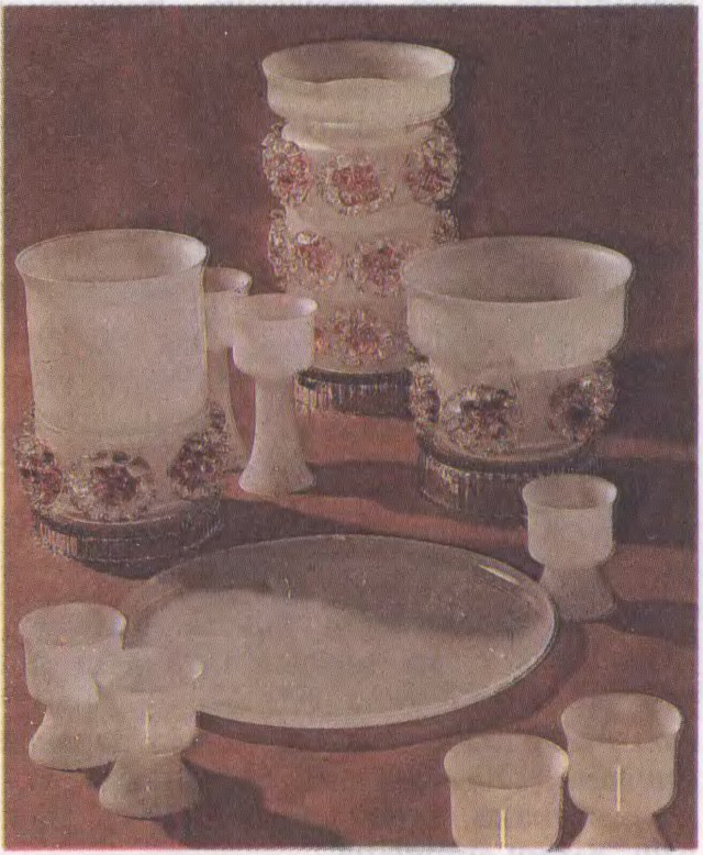 мастацкія вырабы Барысаўскага хрусталёвага завода імя Дзяржынскага з каляровага і бясколернага шкла і хрусталю.