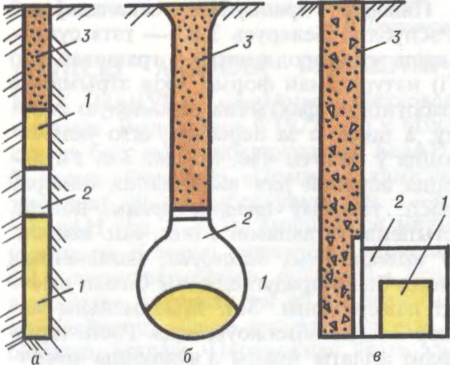 Размяшчэнне зарадаў выбуховага рэчыва ў горных вырабатках: α — шчыліннага; б — катлавога; β — камернага; 1 — выбуховае рэчыва; 2 — паветраны прамежак; 3 — забойка.