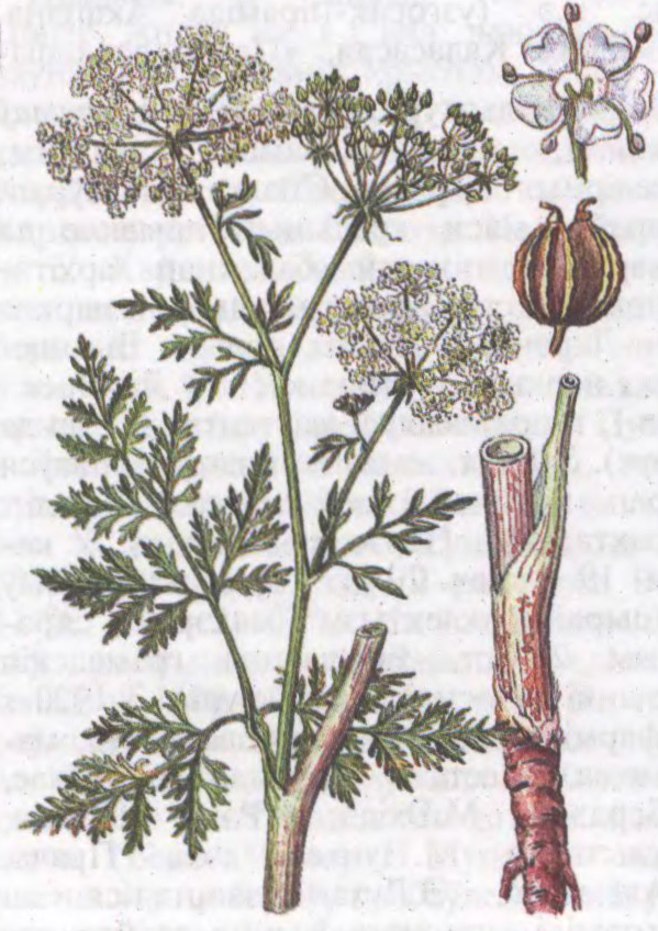 Двухгадовыя травяністыя расліны з непрыемным мышыным пахам. Сцябло голае, галінастае, тонкабаразнаватае, часта з пурпуровымі плямамі. Лісце звычайна тройчыперыстае, з похвамі. Кветкі дробныя, белыя, у складаных шчыткападобных парасоніках. Плод — віслаплоднік. Лек. (болепатольны, заспакаяльны і проціракавы сродак), дубільныя, інсектыцыдныя і ядавітыя (маюць алкалоіды каніін, халін, канідрын і інш.) расліны.