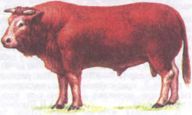 Выш. быкоў у карку да 138 см, маса да 1150 кг, кароў адпаведна да 128 см і 640 кг. Будова цела моцная. Галава кароткая, лоб шырокі, рогі тонкія, закругленыя. Шыя кароткая, тоўстая, грудзі шырокія. Спіна шырокая, роўная. Ногі сярэдняй даўжыні, моцныя. Масць чырв. з адценнямі ад залаціста-рыжай да чырвона-бурай. Малочнасць кароў да 1800 кг з 5% тлушчу. Гадавалыя бычкі могуць дасягаць масы 450—500 кг. Мяса з унутрымускульным тлушчам.