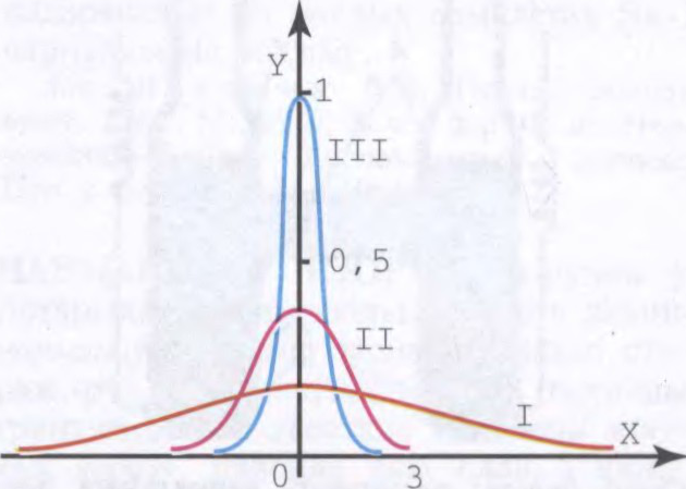 Крывыя шчыльнасці імавернасці y = p(x,σ) нармальнага размеркавання для розных значэнняў параметра σ: 1 — σ = 2,5; II — σ = 1; III — σ = 0,4.