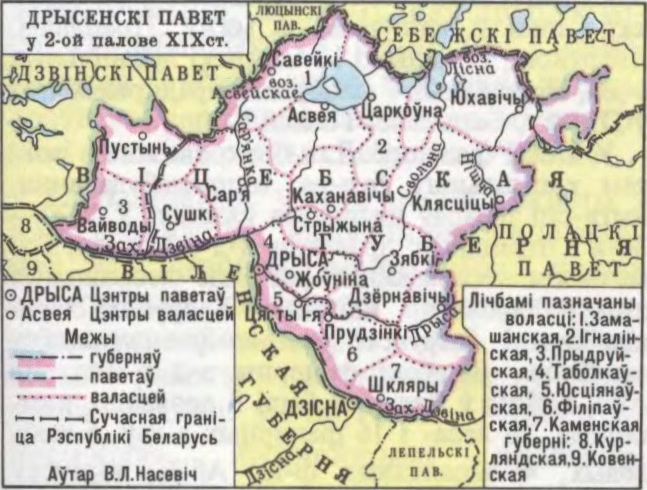 адм.-тэр. адзінка на тэр. Беларусі ў 18—20 ст. Утвораны 4.9.1776 у Полацкай губерні пасля 1-га падзелу Рэчы Паспалітай. 23.12.1796 скасаваны, яго тэр. перададзена Беларускай губерні. 11.3.1802 адноўлены ў складзе Віцебскай губерні. Цэнтр — г. Дрыса. Пл. 2568, 9 кв. вёрст, нас. 97 083 чал. (1897). Уключаў 17 валасцей: Асвейскую, Дзёрнавіцкую, Замашанскую, Зябкаўскую, Ігналінскую, Каменскую, Каханавіцкую, Клясціцкую, Прыдруйскую, Пустынскую, Сар’янскую, Стрыжанскую, Сушкоўскую, Таболкаўскую, Філіпаўскую, Юстыянаўскую і Юхавіцкую; 7 мястэчак, 811 паселішчаў сельскага тыпу. У студз. 1919 Клясціцкая вол. перададзена ў Полацкі павет. Паводле мірнага дагавора Расіі з Латвіяй ад 11.8.1920 Прыдруйская і Пустынская вол. ўвайшлі ў склад Латвіі. Скасаваны 15.2.1923, яго тэр. ўключана ў Полацкі пав.