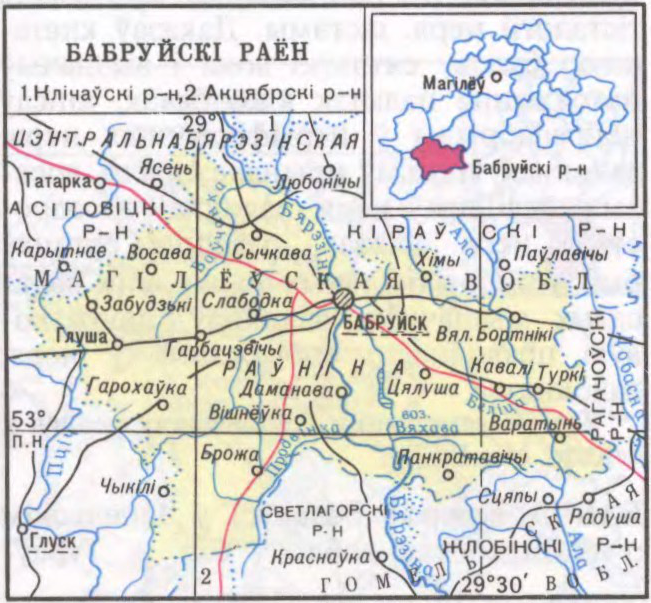 у Беларусі, на ПнЗ Магілёўскай вобл. Утвораны 4.8.1927. Пл. 1,6 тыс.км². Нас. 29,2 тыс.чал. (1995), гарадскога 7%. Сярэдняя шчыльн. 18 чал./км². Цэнтр — г. Бабруйск; р.п.Глуша, 225 сельскіх нас. пунктаў. 12 сельсаветаў: Бортнікаўскі, Брожскі, Варатынскі, Вішнёўскі, Восаўскі, Гарбацэвіцкі, Гарохаўскі, Кавалёўскі, Слабодкаўскі, Сычкаўскі, Хімоўскі, Цялушскі.