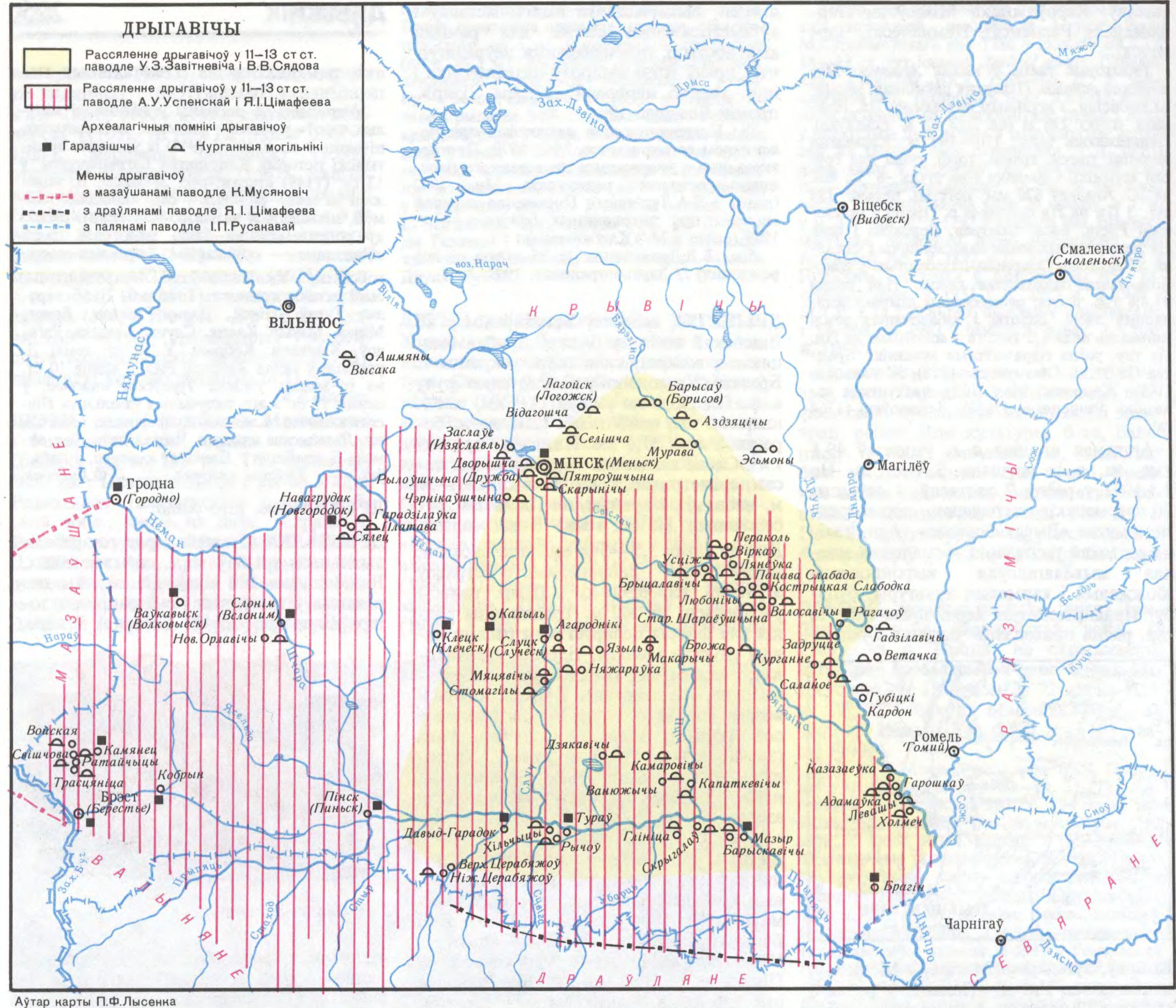 адно з племянных аб’яднанняў усх. славян, вядомых па пісьмовых крыніцах і археал. помніках. Займалі тэр. на У да Дняпра, на Пн да лініі Барысаў—Лагойск—Заслаўе—вярхоўе Нёмана; на Пд мяжа пераходзіла за Прыпяць, на З — за Зах. Буг (паводле інш. даных да Выганашчанскага балота, на Пн ад Пінска). У 6—8 ст. папярэднікамі Д. на сярэдняй Прыпяці былі славянскія плямёны пражскай культуры. На Пн ад Прыпяці ў гэты час жылі балцкія плямёны (гл.Балты). На тэр. рассялення Д. захаваліся археал. помнікі: гарадзішчы, селішчы, курганныя могільнікі з пахавальным абрадам трупаспалення, з 10 ст. — могільнікі з пахавальным абрадам трупапалажэння на гарызонце або падкурганнай яме. Зрэдку ў курганах трапляюцца збудаванні ў выглядзе невысокага драўлянага зруба, накрытага дахам. Пахавальны інвентар: гліняныя гаршкі, спражкі, крэсівы, сякеры, наканечнікі коп’яў і інш.; у жаночых пахаваннях пераважаюць упрыгожанні: шкляныя каляровыя разнастайныя па памерах і форме пацеркі, бронзавыя скроневыя кольцы з заходзячымі канцамі, пярсцёнкі, бранзалеты і інш. Характэрныя племянныя адзнакі — вял. медныя або сярэбраныя пацеркі, аздобленыя зерню, і скроневыя кольцы-завушніцы з круглага дроту, на якіх замацаваны па 3 металічныя пацеркі невял. памераў.