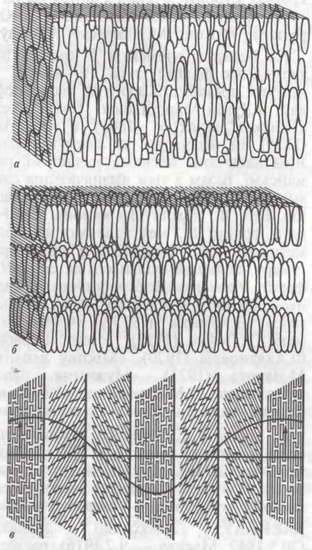 Тыпы вадкіх крышталёў: а — нематычны; б — смектычны; в — халестэрычны.