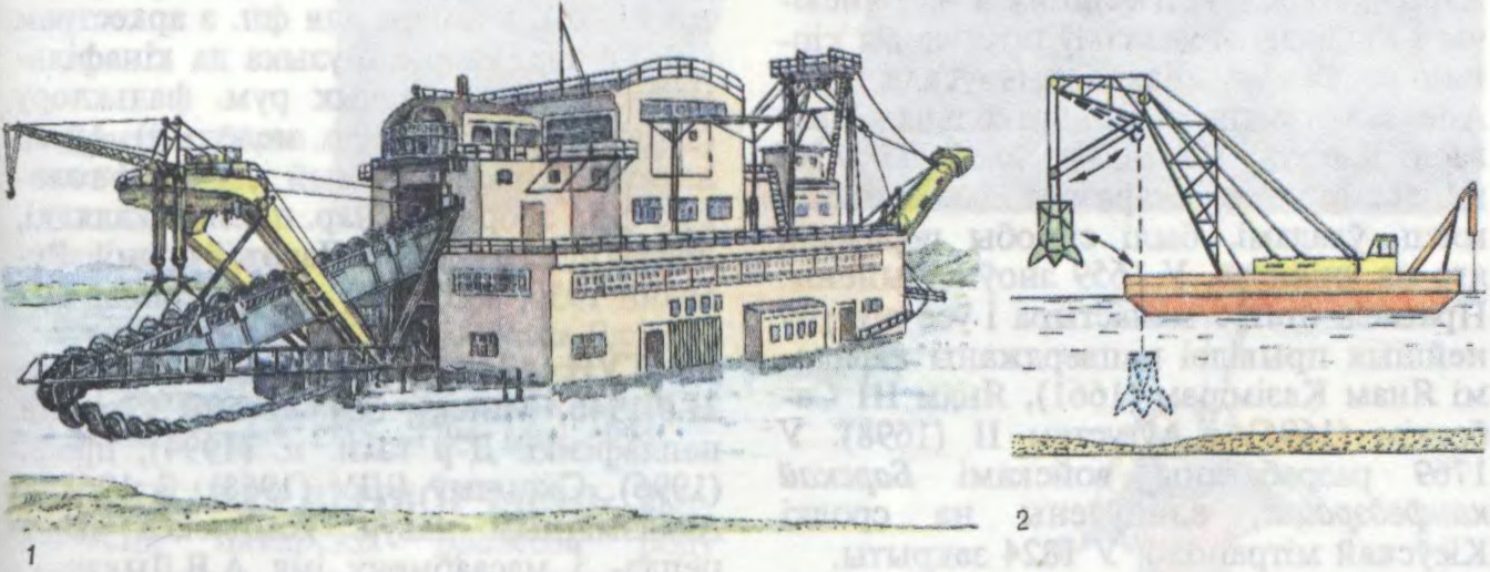Драга: 1 — шматчарпаковая (з чарпакамі па 210 л); 2 — грэйферная (схема).