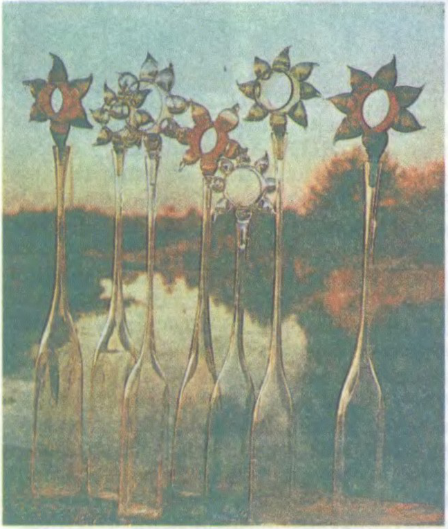 Ябланец, Чэхія), «Шкляныя метамарфозы» (1973), «Птушкі» (1980), «Акулы» (1983), «Сёння на світанні» (1984), «Венерыны чаравічкі» (1993); камплекты посуду «Мядзведзі» (1967), «Марыя Сцюарт» (1993), дробная пластыка «Пеўні» (1972), «Дэльфіны» (1977); блюда «Дуб» (1974), куфель з партрэтам У.С.Высоцкага (1990) і інш. Аўтар вітражоў-карцін «Пётр I», «Карэта» (абедзве 1973). Іл.гл. таксама да арт.Дэкаратыўна-прыкладное мастацтва.