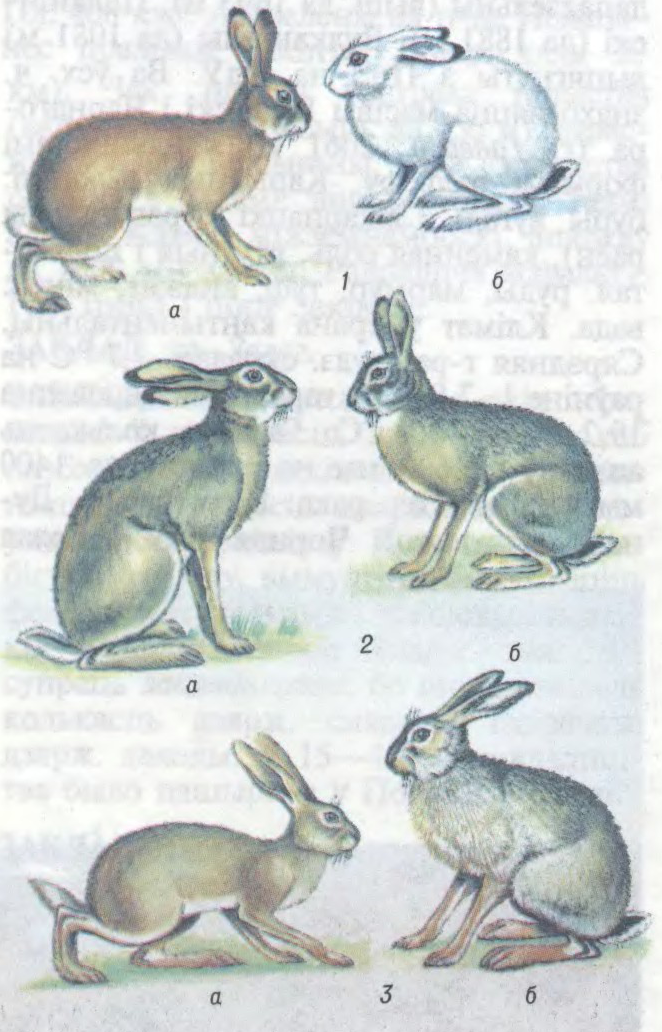 Зайцы: 1 — бяляк, 2 — русак, 3 — талай (а — летам; б — зімой).