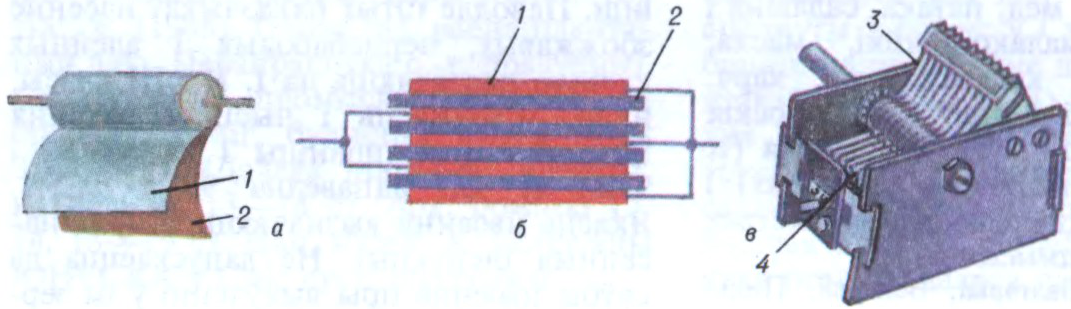 Будова кандэнсатараў электрычных: а — папяровых; б — слюдзяных; в — паветраных; 1 — абкладка (фольга); 2 — дыэлектрык; 3 — ротарныя пласціны; 4 — статарныя пласціны.
