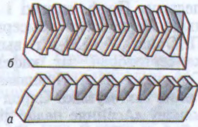 Да арт.Зубарэзны інструмент. Зубарэзныя грабяні: а — прамазубы; б — касазубы.