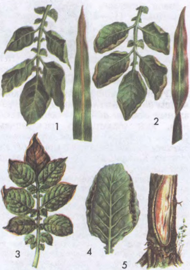 Неінфекцыйныя хваробы раслін: 1, 2 — азотнае і фосфарнае галаданне бульбы і кукурузы; 3 — калійнае галаданне бульбы (бронзавасць лісця); 4 — шкоднае дзеянне глебавай кіслотнасці на капусту; 5 — маразабоіны на ствале яблыні.