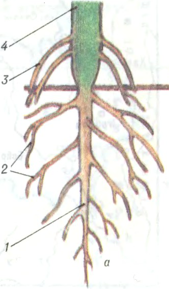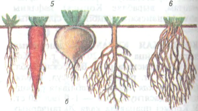 Да арт.Корань: а — віды каранёў: 1 — галоўны; 2 — бакавыя; 3 — прыдаткавыя; 4 — сцябло; б — каранёвыя сістэмы: 5 — стрыжнёвая; 6 — валасніковістая.