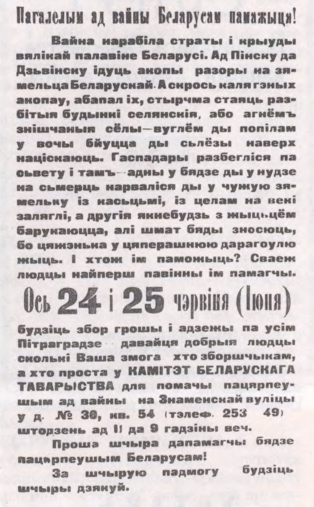 БЕЛАРУ́СКАЕ ТАВАРЫ́СТВА Ў ПЕТРАГРА́ДЗЕ ПА АКАЗА́ННІ ДАПАМО́ГІ ПАЦЯРПЕ́ЛЫМ АД ВАЙНЫ́,