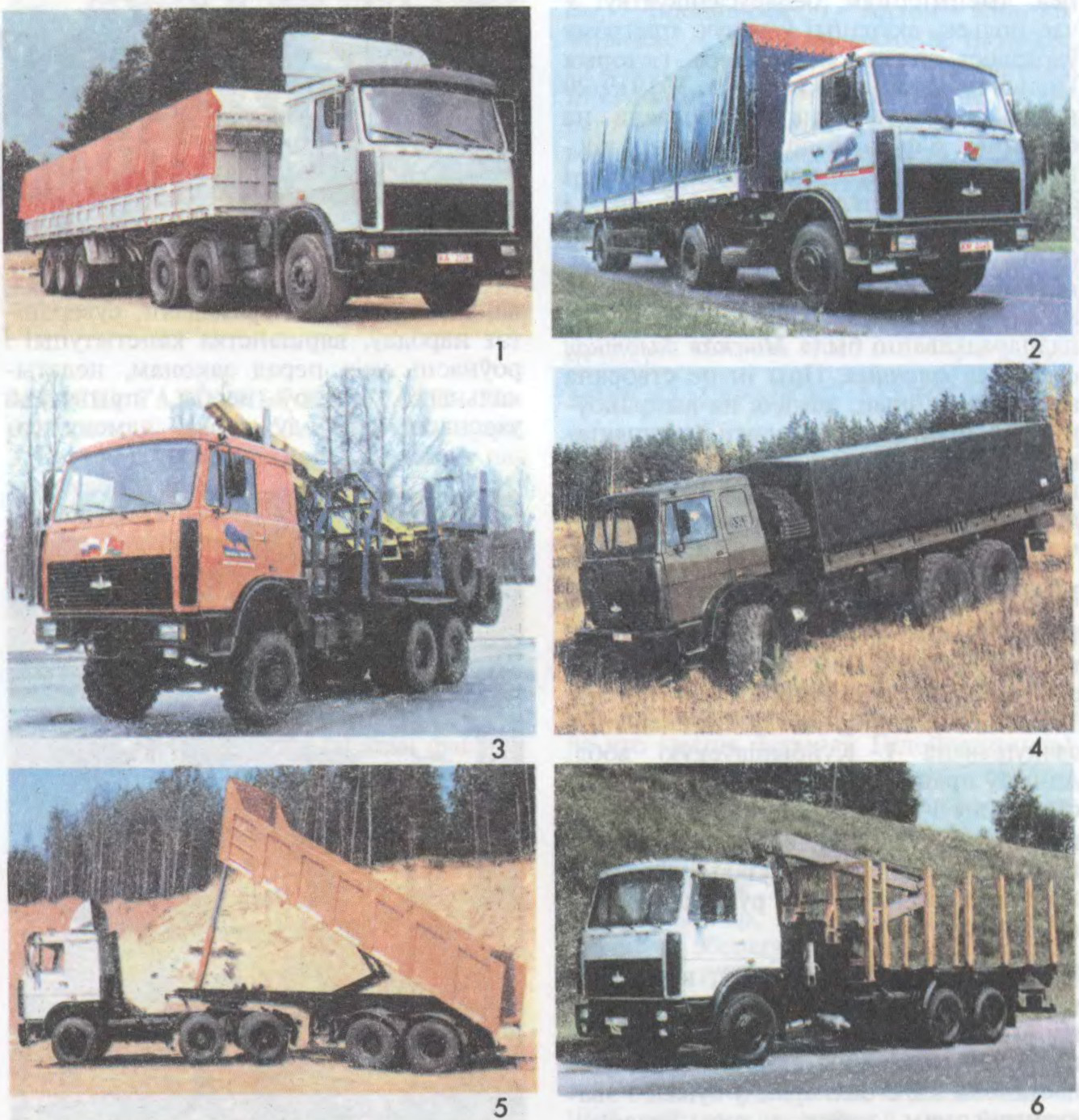 Узоры прадукцыі Мінскага аўтамабільнага завода: 1 — аўтамабільны трохвосевы прычэп МАЗ-3РР59; 2 — седлавы цягач МАЗ-54329; 3 — цягач лесавозны МАЗ-64255; 4 — аўтамабіль бартавы МАЗ-63172; 5 — аўтамабільны двухвосевы паўпрычэп-самазвал МАЗ-9506; 6 — аўтамабіль-сартыментавоз МАЗ-6303-26.