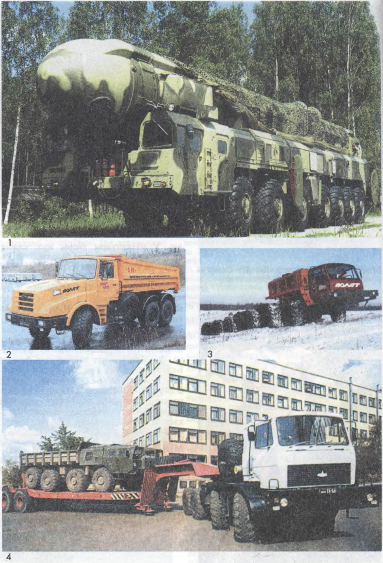 Узоры прадукцыі Мінскага завода колавых цягачоў: 1 — шасі колавае МЗКТ-7917 са стратэгічнай ракетай «Таполя»; 2 — аўтамабіль-самазвал МЗКТ-6525; 3 — спецыяльнае шасі МЗКТ-79191; 4 — аўтапоезд у складзе цягача седлавога МЗКТ-7429 і паўпрычэпа МЗКТ-9378.