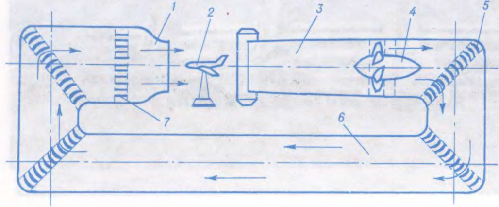 Аэрадынамічная труба мае: сапло, праз якое праходзіць паветра; кіравальныя лапаткі, што надаюць паветр. патоку патрэбны напрамак; рабочую частку, дзе знаходзяцца доследны аб’ект і датчыкі фіз. велічыняў для вымярэння; вентылятар або кампрэсар, якія ўтвараюць паток газу; дыфузар для выдалення газу. У аэрадынамічнай трубе вывучаюць мадэлі або рэальныя аб’екты, вымяраюць сілы, што дзейнічаюць пры палёце самалётаў, ракет, пры руху цягнікоў і інш.трансп. сродкаў; праводзяць даследаванні і вызначаюць аптымальную форму гэтых аб’ектаў.