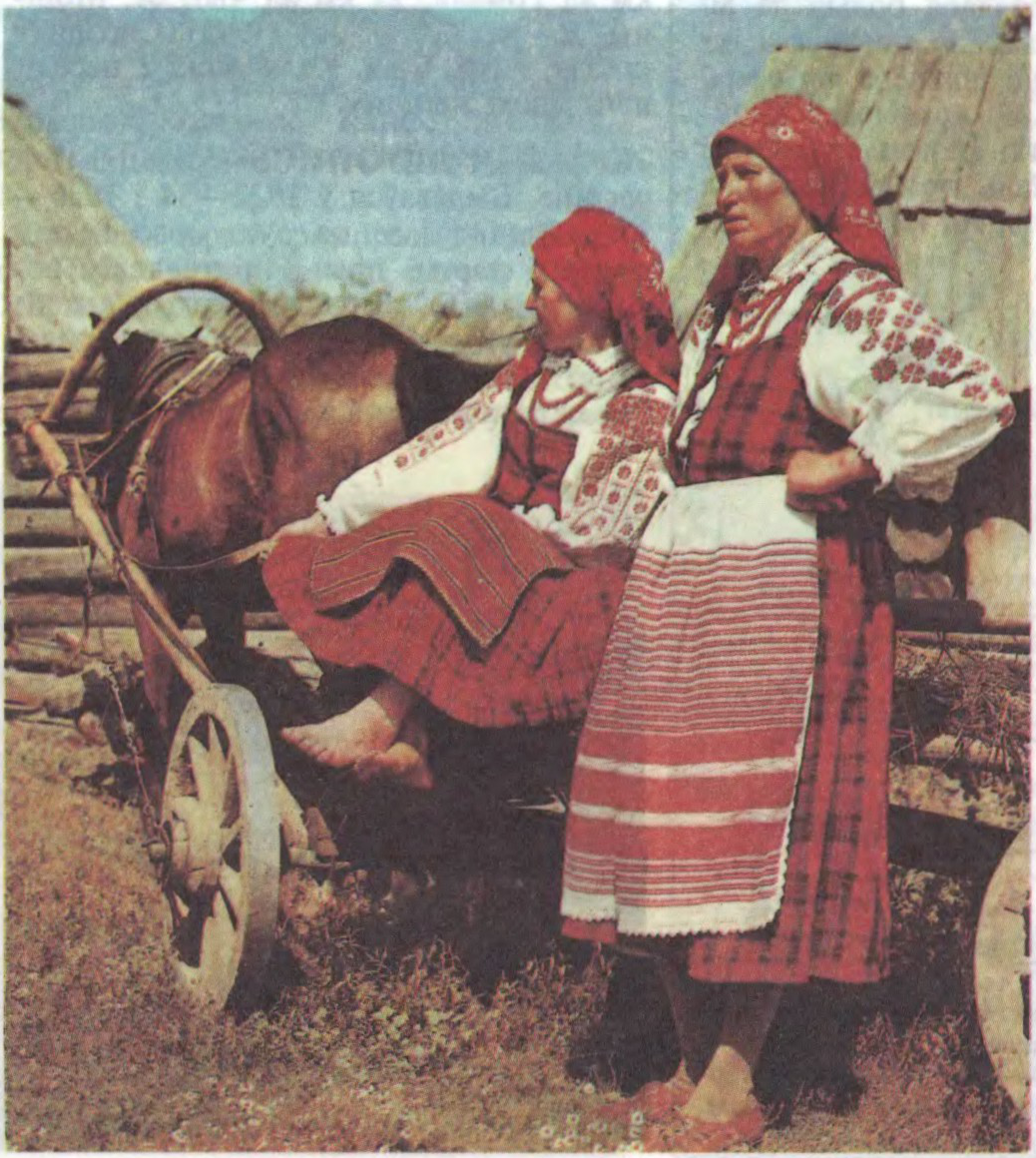 У жаночым гарнітуры пашыраны 4 комплексы: кашуля, расхінная панёва, гарсэт, намітка; кашуля, андарак з дзесяткай (спадніца з прышытым ліфам-гарсэтам, у асобных варыянтах нагадвала сарафан на лямках), 1-полкавы суконны фартух, хустка; кашуля, андарак, 4-полкавы льняны фартух, хустка; кашуля або блуза, кроеная з гэсткай, крамная спадніца з прышыўным ліфам, 1-полкавы фартух, чапец. Кашулю кроілі з прамымі плечавымі ўстаўкамі, прышытымі па ўтку, з вял. адкладным каўняром, аздобленым па краях паскам вязаных белых карункаў або паркалёвых брыжоў. Шырокі рукаў злучаўся з плечавой устаўкай, аздобленай узорыстым паскам мярэжкі з чырвона-чорным геам. арнаментам. Вышыты баваўнянымі ніткамі арнамент 8-пялёсткавых разетак, ромбаў, квадратаў кампанаваўся радамі, у шахматным парадку або размяшчаўся ў ячэйках, што ўтвараліся перасячэннем дыяганальных або гарыз. і верт. палос, густа нашываўся на бачную паверхню рукавоў. Фартухі аздаблялі ўзорыстым ткацтвам. вышыўкай, аплікацыяй; панёву, андарак затыкалі клятчастым вохрыста-чырвоным арнаментам. Андарак і ліф-гарсэт саяна часам кроілі з розных тканін: ніз з клятчастай даматканкі,- ліф з крамнай узорыстай ці аднатоннай. Спадніцу шылі з клятчастага, паласатага, белага, бела-сіняга палатна. Падпяразвалі вузкім поясам, канцы якога аздаблялі дэкар. кутасамі, нізкамі рознакаляровага бісеру. Галаўныя ўборы жанчын — намітка, чапец (вязаны з белых нітак або шыты з чырвоных тканін), хустка. Насілі пацеркі, шыйныя бісерныя паскі, абразкі. Мужчынскія кашулі кроілі з плечавымі ўстаўкамі або тунікападобныя; вышывалі манішку, падол, каўнер і каўнерцы, падпяразвалі поясам. Нагавіцы шылі з палатна, шэрага ці карычневага сукна. Вопратку (світу, шубу, кажух, куртку, сак) аздаблялі нашыўкамі і аблямоўкамі фабрычных (чырвоных, сініх) тканін, аплікацыяй шнурам.