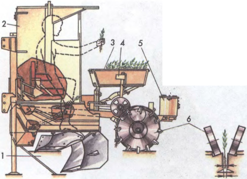 Схема універсальнай лесапасадачнай машыны: 1 — вялікі сашнік; 2 — ахоўная агароджа; 3 — скрыня з пасадачным матэрыялам; 4 — пасадачны апарат; 5 — баластная скрыня; 6 — ушчыльняльны каток.
