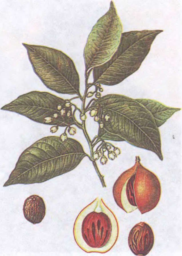 насенне з пладоў мускатніку духмянага (Myristica fragrans). Культывуюць у тропіках абодвух паўшар’яў. Плод — яйцападобная аранжава-жоўтая мясістая ягада